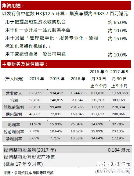 经营业绩方面,受益于公司主营业务物业管理服务所得收入持续实现稳定快速增长,公司的毛利率从2014年的11.96%增长到2017年9月30日的32.78%。税前利润率和净利润率也呈现快速的上升态势,分别从14年的7.73%和5.65%增长到17年9月30日的23.13%和17.19%。公司经营十分稳健。考虑到公司作为中国物业管理行业具有竞争性市场地位的先驱者,旅游地产管理专家及大盘物业管理的领跑者和背靠雅居乐集团和绿地控股两大主要股东等优势,公司有望保持继续成长。