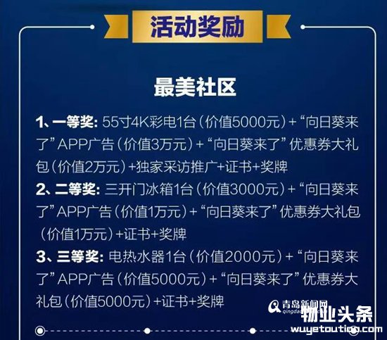 在全市严抓物业管理,敦促物业服务升级的大背景下,近日,由青岛市物业管理协会主办,青岛新闻网、青岛向日葵互联信息服务有限公司承办的“青岛向日葵来了杯”寻找青岛“最美社区”、“五心服务人员”的评选活动即将开始,邀请全市百姓为自己最满意的社区和服务人员投上一票,获奖单位和个人均有大奖可拿。
