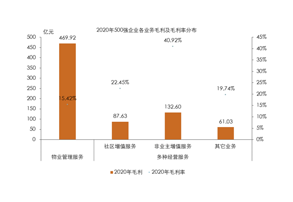2020年,500强企业物业管理服务毛利为469.92亿元,均值为9398.37万元,毛利率为15.42%。多种经营服务毛利为281.27亿元,均值为5625.41万元,毛利率达27.48%,高于基础物业管理服务。其中,社区增值服务毛利和非业主增值服务毛利分别为87.63亿元和132.60亿元,均值为1752.66亿元和2652.06亿元,毛利率分别为22.45%和40.92%。