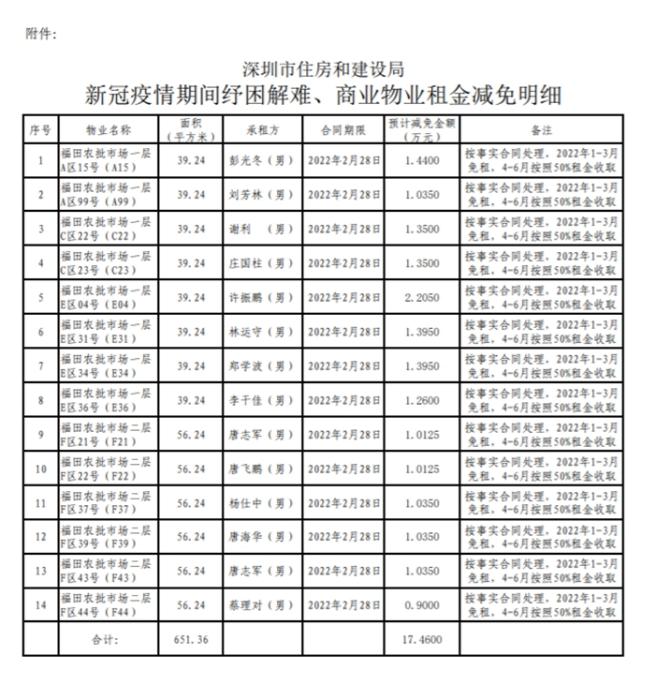 深圳市住房和建设局公布的减免明细显示,共减免了14位租户的17.46万元租金。