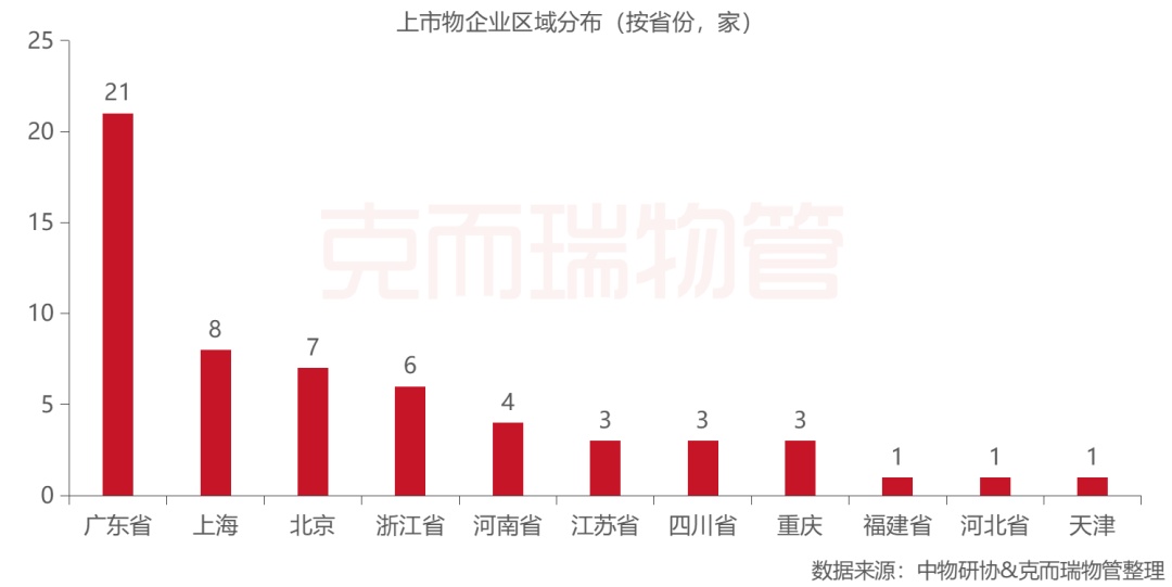 从区域划分上看,58家上市物企分布在全国11个省、直辖市,共计15个城市。其中,有21家上市物企位于广东省,占上市企业总数的近四成(36.2%)。北上广深四个一线城市上市物企共有33家,占比近六成(56.9%)。其中,广州市和深圳市均为9家,两市占比已超三成(31.0%),上海市和北京市分别为8家和7家,分别占比13.8%和12.1%。