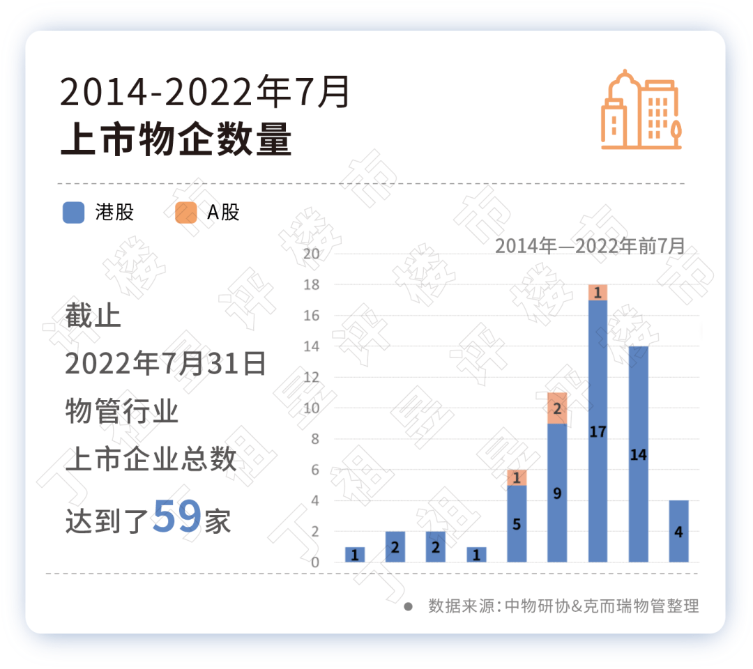 据克而瑞物管监测,截止2022年7月31日,物管行业上市企业总数达到了59家,年内成功上市的物企有4家,另有8家递表企业正在排队。