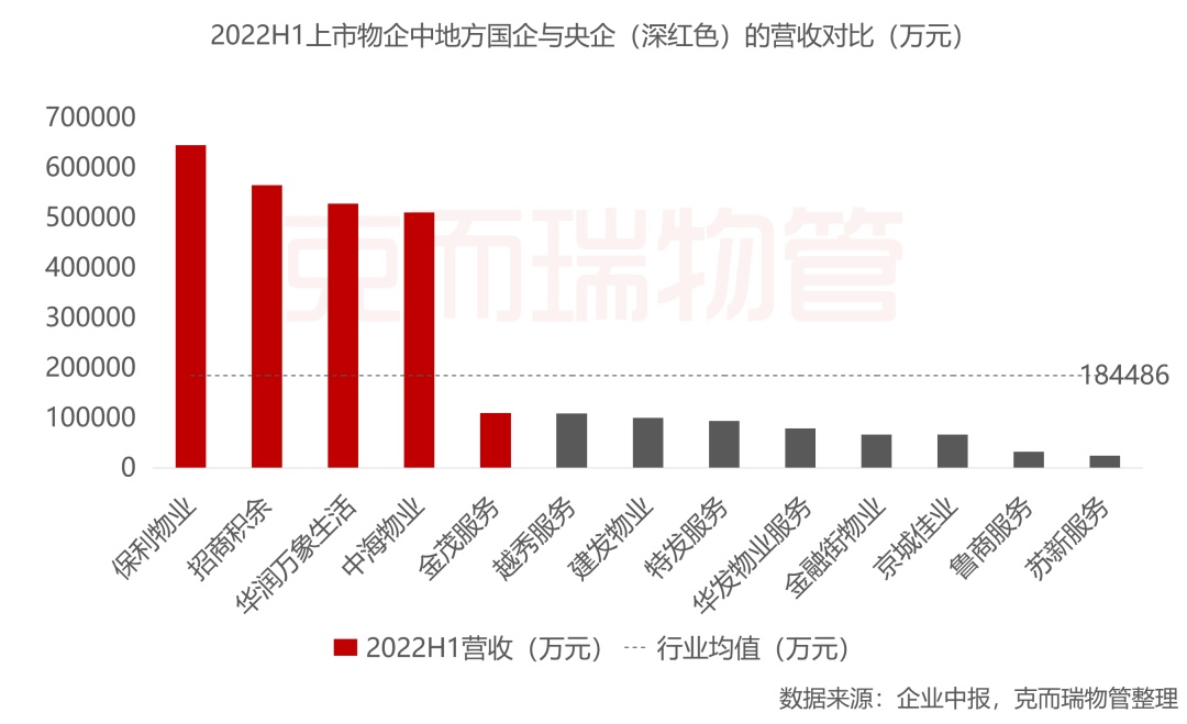 根据2022年中报业绩显示,共有13家国资上市物企披露了其上半年的营收数据。其中,5家央企集团旗下物企的营收均值为47.15亿元,远高于8家地方国资物企7.14亿元的营收均值。央企集团旗下营收最低的上市物企——金茂服务,在数据上依然可以领先全部地方国资物企,二者之间存在明显差距。