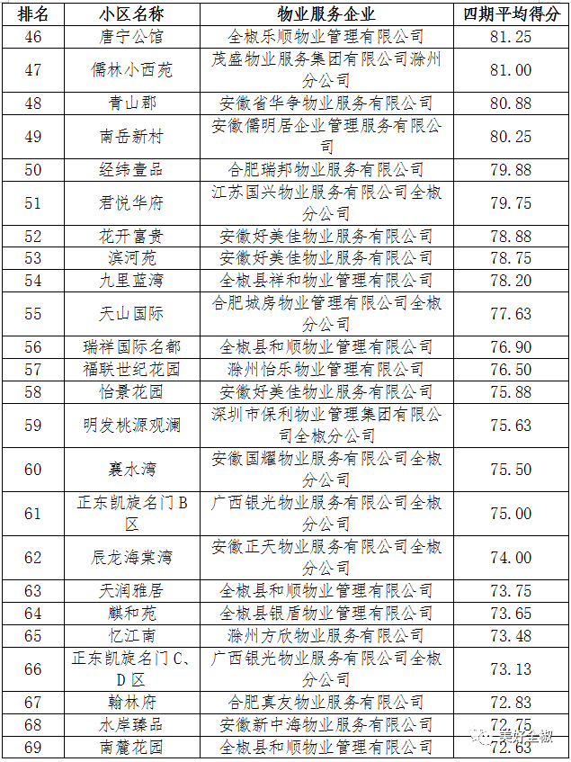 为进一步规范物业服务企业行为,加强物业服务监管,提高物业服务水平,根据《安徽省物业管理条例》、《全椒县物业服务质量考评方案》和《全椒县普通住宅小区物业考核办法》等相关文件要求,全椒县住房和城乡建设局委托第三方于2022年7月至2023年3月,对全县范围内120个物业小区开展季度(共四期)实地测评。现将考核结果予以通报。