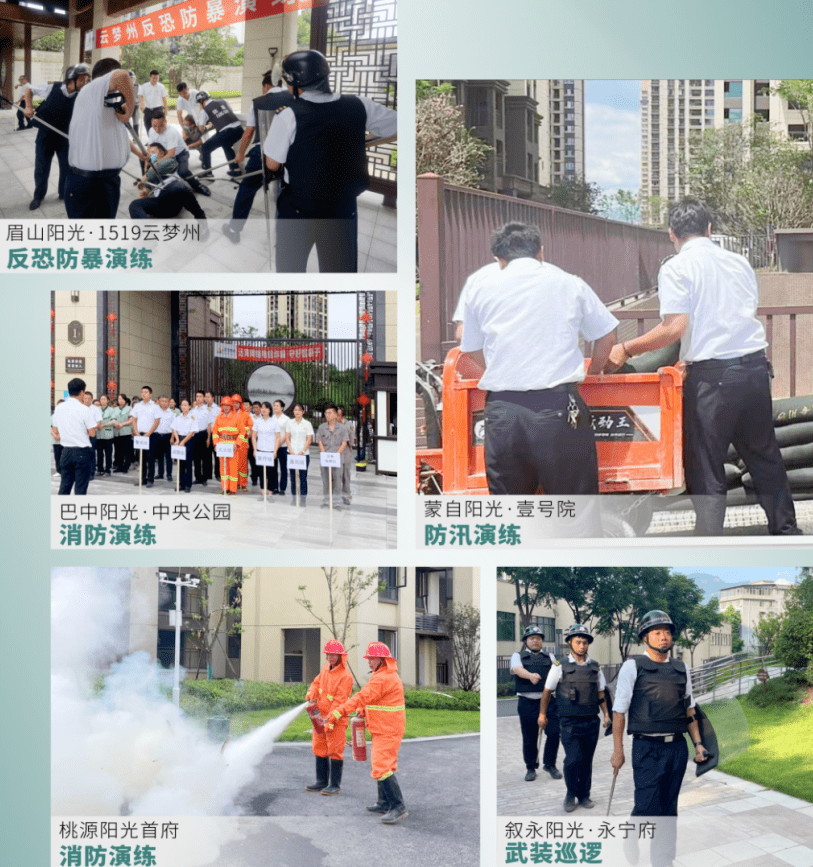 防风险,除隐患,筑牢园区安全堡垒。8月,阳光大地集团阳光物业各项目进行反恐防暴演练、防汛演练、消防演练和武装巡逻等,以多举措筑牢安全防线,以实际行动为园区安全保驾护航。