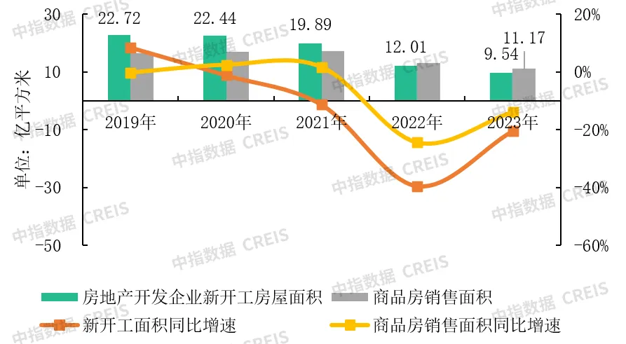 图:2019-2023年房地产开发企业新开工面积及商品房销售面积情况