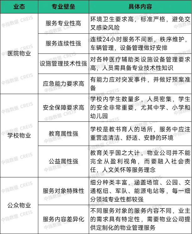 公众物业由于涵盖了场馆、公园、交通枢纽、军队、能源电站等多种细分业态,服务对象多样化,特殊性强。同时,不同项目的服务内容差异较大,业主需求特殊性强,需要物业公司提供定制化的物业管理服务。