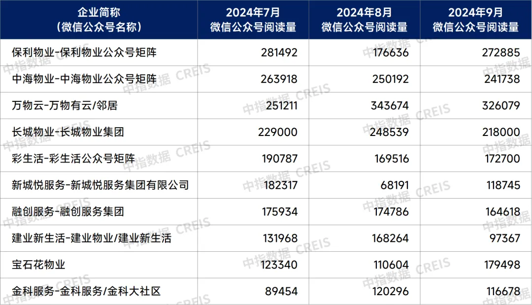 2024年9月,TOP50企业微信公众号阅读量共计约325.4万次,微信公众号阅读量均值约6.5万次。其中,公众号万物有云/邻居、保利物业公众号矩阵、中海物业公众号矩阵的阅读量超过分列前三位,均超过20万次。分层级来看,TOP10企业微信公众号阅读量均值为19.1万次,TOP11至TOP30企业微信公众号阅读量均值5.04万次。