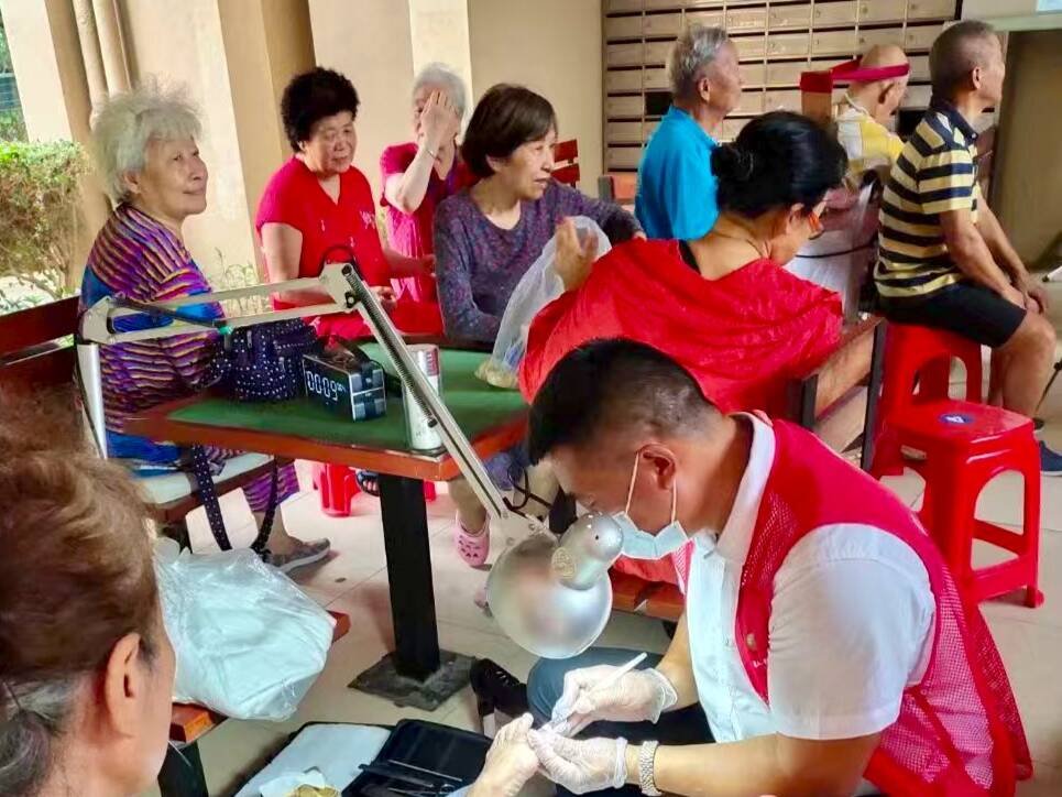9月29日下午,记者在三亚凤凰水城社区一楼活动中心看见了一些平时不太常见的工具用品:一桶泡脚水、整齐的消毒工具、干净的毛巾和专业的照明灯。一名穿着印有“三亚市天涯区弘民义工社”字样的义工正专注地为老人修剪脚部指甲,他手上的动作不曾停歇,还陪着老人聊天解闷。