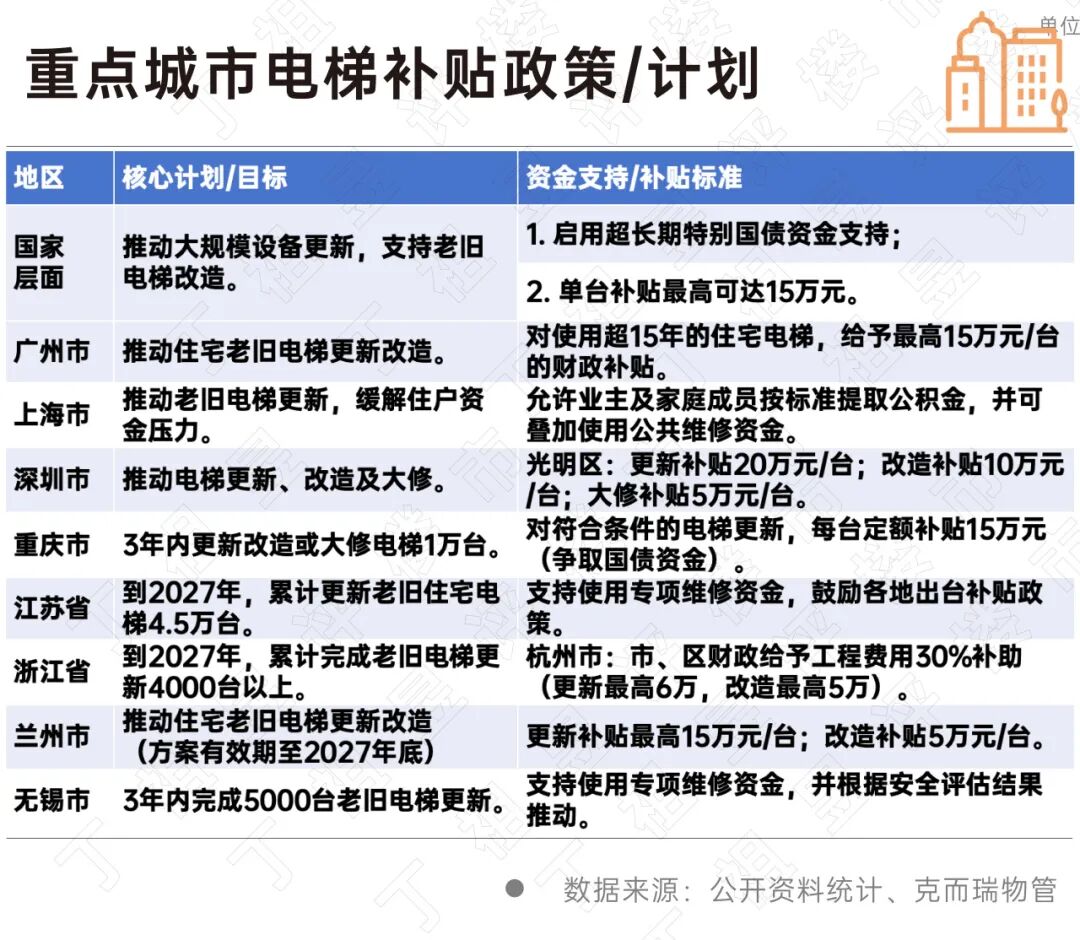 从重点城市电梯补贴政策来看,单台补贴最高可达15万元,上海更是允许业主及家庭成员按标准提取公积金,并可叠加使用公共维修资金。各地政策的支持使得电梯更新对于物业企业而言,不再是高风险的尝试,而是一门权责清晰、回报明确的稳健生意。