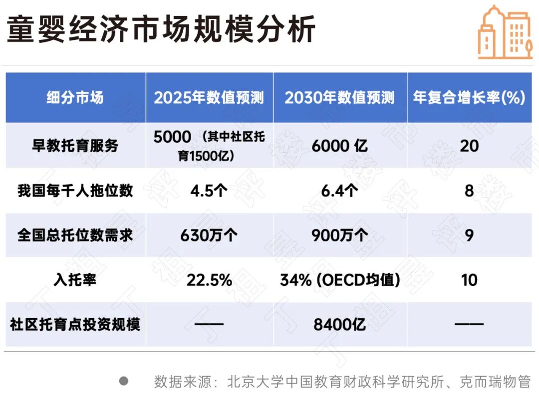 目前我国社区托育市场存在供给与需求之间的巨大结构性不足,缺乏家门口的、可信赖的、普惠的托育服务,数据显示:到2030年,全国托位数缺口将高达900万个,导致我国入托率仅22.5%,远低于发达国家平均水平,大量需求被压抑。正是这种供需失衡,推动早教托育服务市场以20%的年复合增长率逆势上扬,其中,与我们业务模式最契合的社区托育,2025年市场规模预计将达1500亿元。这也为身处社区一线的物业企业,提供了优秀的战略机遇。