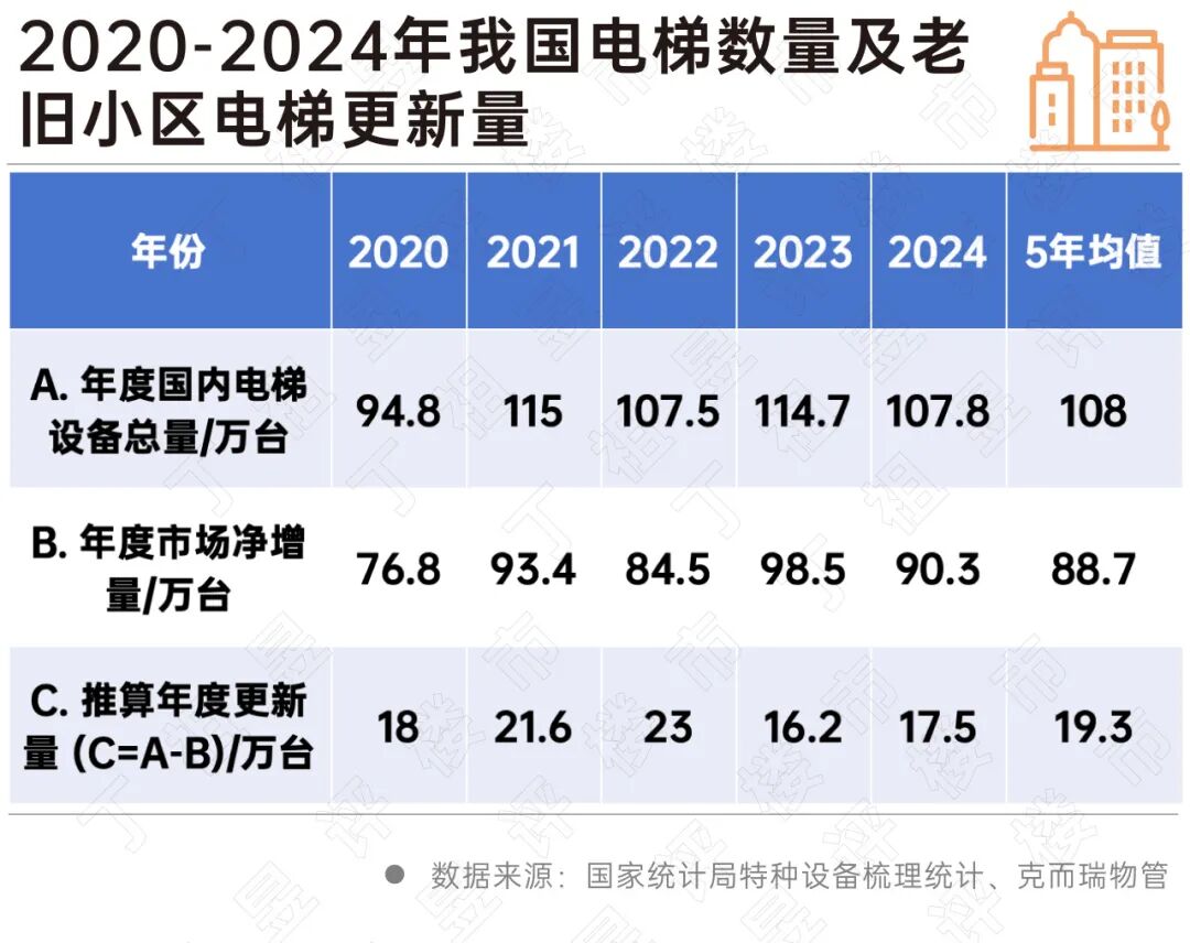 “上楼难”是老旧小区居民,尤其是老年群体最核心的痛点之一。因此,加装新梯与更新旧梯,成为本轮城市更新中确定性最高的“标配”项目。我国电梯市场已进入成熟的存量替换阶段,测算显示,2020至2024年的年度电梯更新量五年均值已达到19.3万台,形成了一个规模巨大且持续的更新市场。