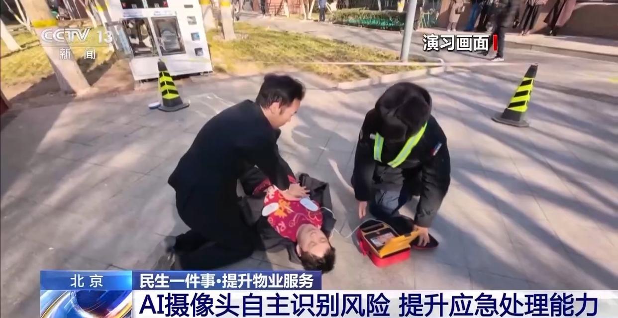 在小区广场,一位正在打水的男子突然倒地。这一突发情况被AI摄像头捕捉后识别为异常情况,几乎同一时间,在物业中控室内,大屏幕上就弹出了预警信息。不一会儿,受过专业救援培训物业工作人员就已经携带专业设备迅速抵达现场实施救助。