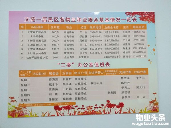 记者今天在文苑一“三委办公室”看到,粉刷一新的办公室里,办公桌、电脑等办公用品一应俱全,墙上贴着居民区7个业委会和5家物业公司联系人名单、联系方式及有关责任章程。据凉城街道负责人介绍,“三委办公室”设在居委会同一楼里,便于居民找到,同时物业在居民区有了“落脚点”,业委会也不用另找办公地点了。“三驾马车”在一起办公,居民有什么“边界”不清的问题,“三驾马车”代表当场可以决定哪一方是解决问题的“主角”;如果需要一起解决的,则马上可以拍板,再也不会让居民来回奔波了。这位负责人告诉记者,对于一个居民区有多家物业如何办公这一问题,采用物业轮流值班制,如有居民反映的问题不是当天值班的物业公司管辖地区,则立即通知居民所在地区管辖的物业处理。