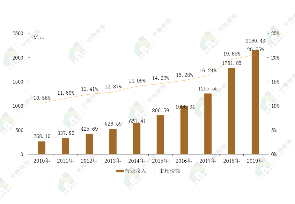 2019年,百强企业营业收入达2160.43亿元,均值21.60亿元,同比增长21.25%,经营业绩稳健增长;占500强企业营业收入的63.40%,较上年增长0.48个百分点;营业收入市场占有率达20.55%,较上年增长0.90个百分点,市场占有率持续提升。