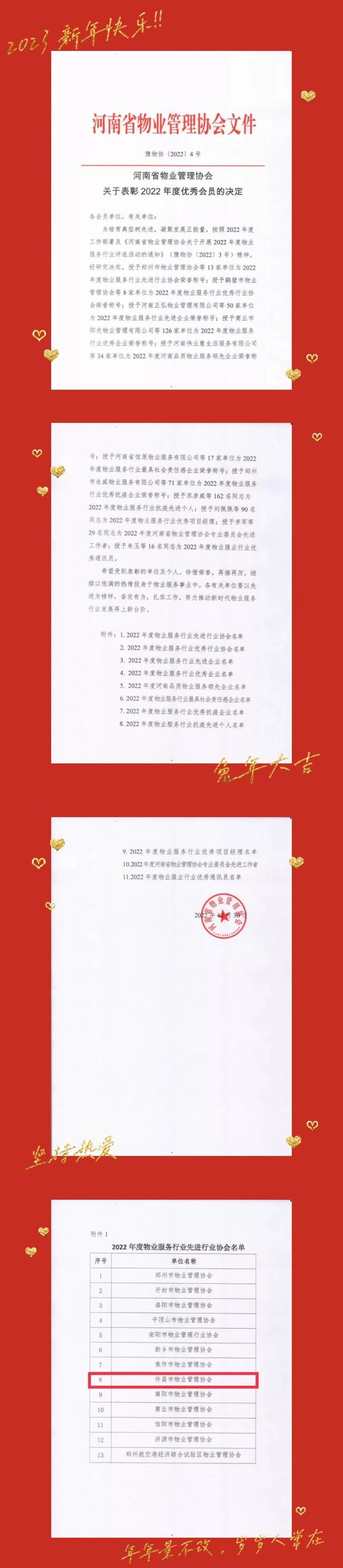 近日,河南省物协下发《关于表彰2022年度优秀会员的决定》,许昌市物协蝉联“全省物业服务行业先进协会”。这是我市物业管理工作坚持改革创新、科学发展的结果;这是各级领导高度重视、大力支持的结果;这是社会各界充分理解、积极配合的结果;这也是全市物业管理工作者不懈努力、辛劳付出的结果。