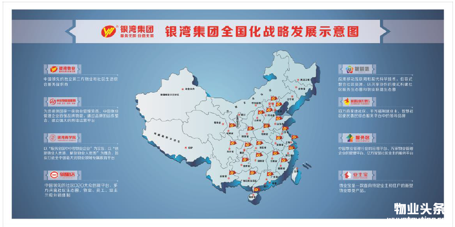 银湾物业审时度势,首创“1+N”连锁加盟商业模式,以物业载体,以业主为资源,以互联网为工具,创建智慧社区综合服务供应商,业务涵盖银湾物业管理、银湾社区生活网、银湾云APP、银湾智慧社区020生活馆、银湾020社区超市、业主宝、中国物业管理商学院、银湾商学院、中国物业加盟网、中国物业联盟网、物业通、智慧社区万里行、银钥匙联盟、服务区、业主贝贝APP、物业贝贝APP、商家贝贝APP、银湾社区传媒、E房通、邻里游、银湾社区健康管理、社区123、业主生活顾问APP、社区合伙社、格物工坊、业主诚信网、中国物业诚信网、盛华社区保险代理、桂冠社区小微贷款等围绕着以“社区业主美好生活综合服务”为核心同心圆的十几个产业板块业务所组成的社区综合服务生态圈和物业产业路由器。